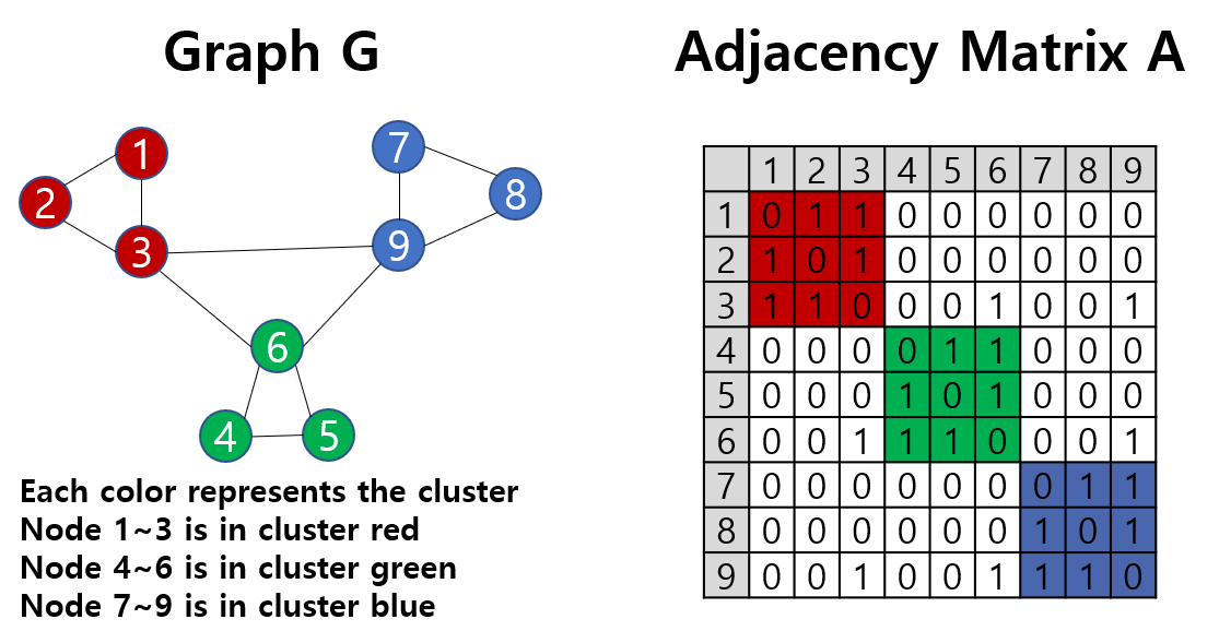 그래프의 예시와 함께 확인해보겠습니다. 아래는 9개의 node로 이루어진 그래프와 그 인접행렬입니다.