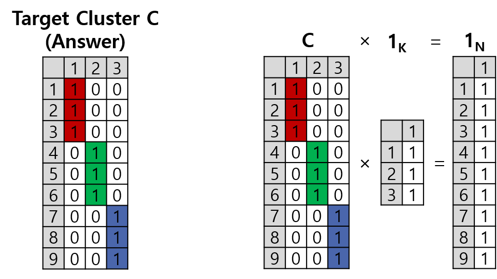 이 그래프의 최적 클러스터가 각각 적색, 녹색, 청색이라고 가정해봅시다. 그러면 최적 cluster 구성을 담은 행렬 \(\mathbf{C}\)를 표기할 수 있습니다. 그리고 \(\mathbf{C}\mathbf{1}_K=\mathbf{1}_N\)가 됨을 보일 수 있습니다.