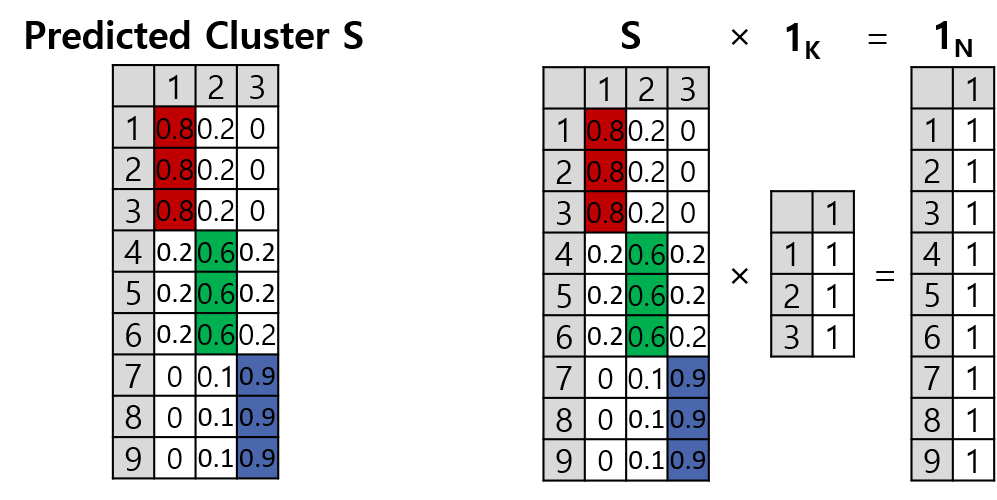 최적 cluster(정답)가 아닌 예측 결과 행렬 \(\mathbf{S}\)에서도 \(\mathbf{S}\mathbf{1}_K=\mathbf{1}_N\)는 성립합니다. \(\mathbf{S}\)의 i 번째 행은 i 번째 node가 각 cluster에 속할 확률을 나타냅니다.